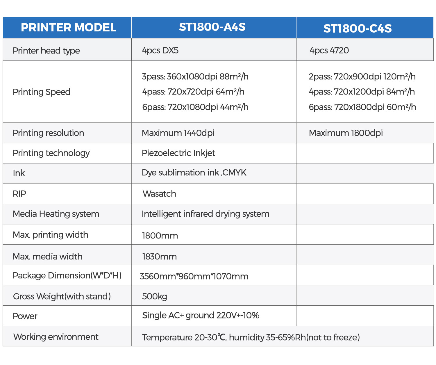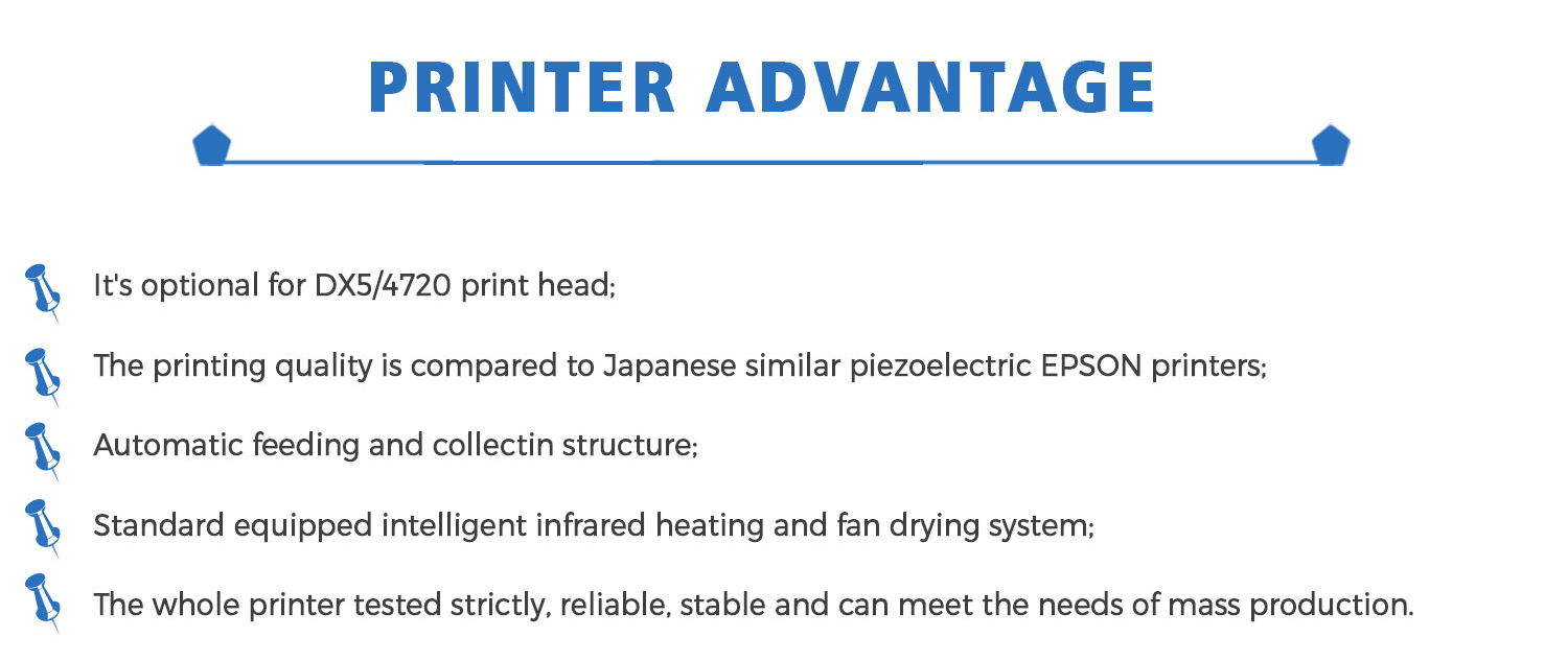 --Standard equipped heating and fan drying system --Automatic feeding and collecting structure --Software: Wasatch7.4 --Color: C,M,Y,K