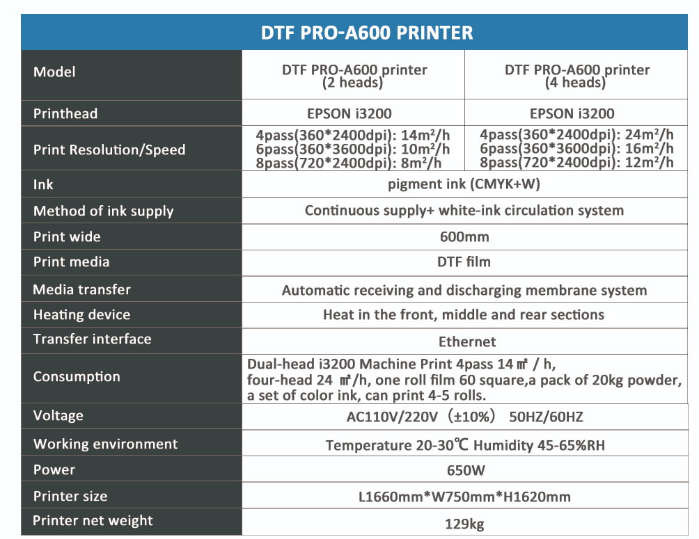 Hanrun paper® PRO-A600 DTF printer is a DTF printer specially developed for those customers who pursue high quality and mass production The Pro series is a high-end flagship series developed by us, compared with the EVO series, the pro series has higher continuous printing stability, more software compatibility, better printing fineness and it also has a half-year longer warranty. The DTF printing device is the market's most advanced DTF solution. In comparison to other hardware systems, the DTF printer has a lot of advantages compares to other machines(including Toner Transfer, or even high-end DTG). The print size for the DTF PRO-A600 printer is 60cm or 24 inches.