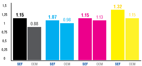 Black&Color Optical Density The colour concentration of SubliNova Sure is high with vivid colour and its optical density is much higher than original inks. The higher the figures, the deeper the optical density.