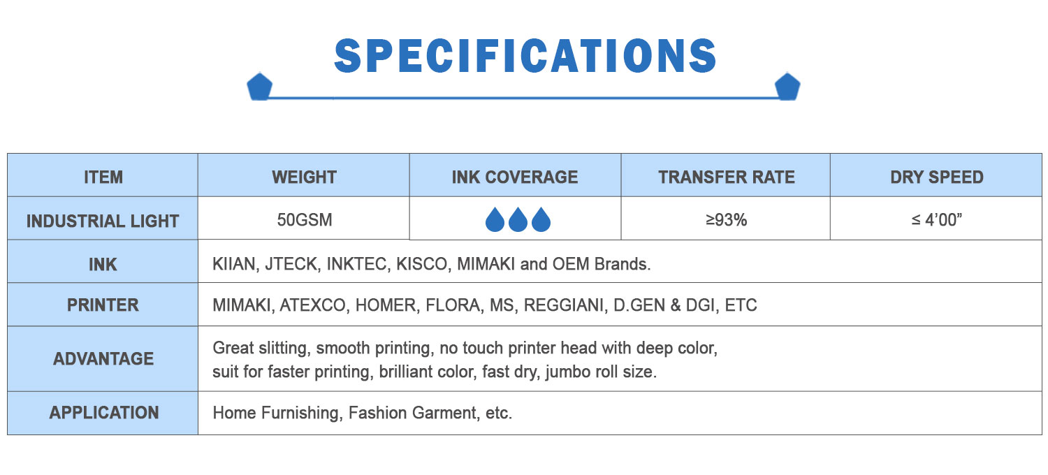 We have our own R&D division and 4 coating lines for normally production daily. We can produce different series sublimation paper weight 40gsm -140gsm, max roll width 3.2m, jumbo roll size up to 10000m length per roll.
