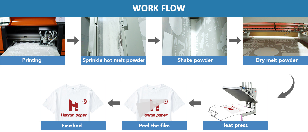 DTF film, also called direct transfer film, direct to film, which is a new technology for T-shirt heat transfer-digital offset heat transfer, you can use our DTF printer to freely print the designed pattern on the coated PET film, then cover the printed pattern on the T-shirt by dust and bake the pattern to melt the powder, and then transfer it to various colors of pure cotton or cotton-polyester blended fabric, cotton canvas and other products by heat transfer machine or electric iron.