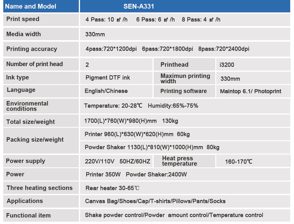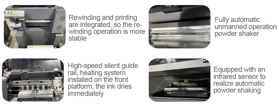 And we finally launched a brand new All-In-One DTF printer, SEN-331, which assembles the printer and the powder shaker. In addition to a smaller footprint and lower investment cost, the integrated design makes the DTF film not easy to skew during the printing and drying process, ensuring the stability of the final product quality.